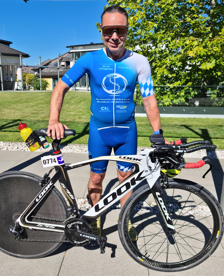 Andreas Büttner startete in diesem Jahr über die Traditionsdistanz des Allgäu-Triathlon: 1.900 m Schwimmen im Alpsee, danach 90 km mit ordentlich Höhenmeter und bis zu 18% steilen Rampen und zum Schluss ein Halbmarathon mit dem berüchtigten Kuhsteig am Ende, dessen 15% sich nach dieser Tortur fast senkrecht anfühlen. Nach dem Erfolg im Open Water Wettbewerb quer durch den Starnberger See war es nicht unerwartet, dass Andreas Büttner als erster seiner Altersklasse mit knapp einer Minute Vorsprung aus dem Wasser kam. Auf dem Rad schmolz dieser Vorsprung schnell dahin und auf der schweren Strecke war es ein Kampf um jeden Höhenmeter. Umso besser gelang dann die Laufstrecke, so dass er am Ende mit Platz 11 die Top 10 seiner Altersklasse nur knapp verfehlte.